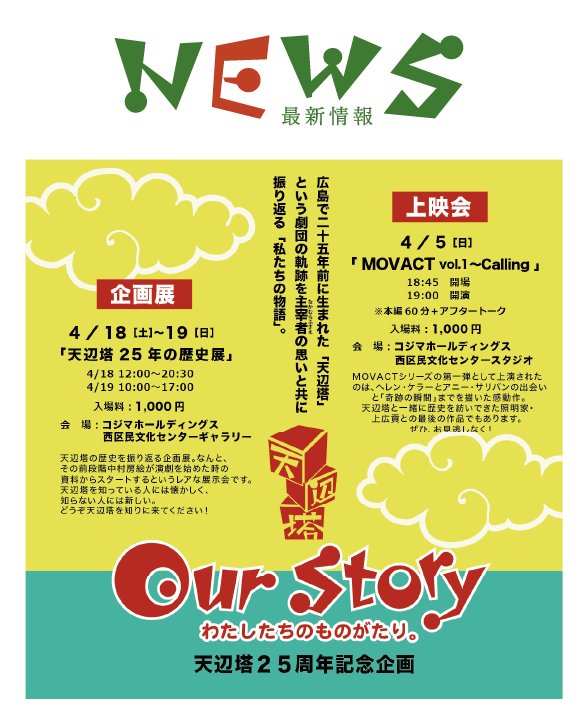 広島で二十五年前に生まれた「天辺塔」 なかむらふさえ という劇団の軌跡を主宰者の思いと共に 振り返る「私たちの物語」。
