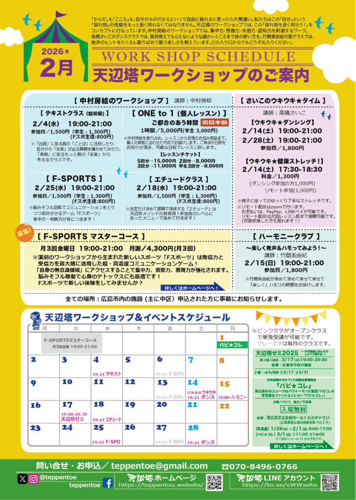「からだ」も「こころ」も、自分のものだからといって自由に操れると思ったら大間違い。私たちはこの「自分」という「容れ物」の性能をもっと良く知らなくてはなりません。天辺塔のワークショップでは、この「容れ物を良く知ろう!」をコンセプトに行なっています。中村房絵のワークショップでは、集中力・共感力・認知力を刺激するワーク。高橋さいこのダンスクラスでは、普段教えてもらえないような細かいところまで体の使い方を。竹間美由紀の歌クラスでは、発声のヒントをたくさん散りばめて歌う楽しさを教えています。