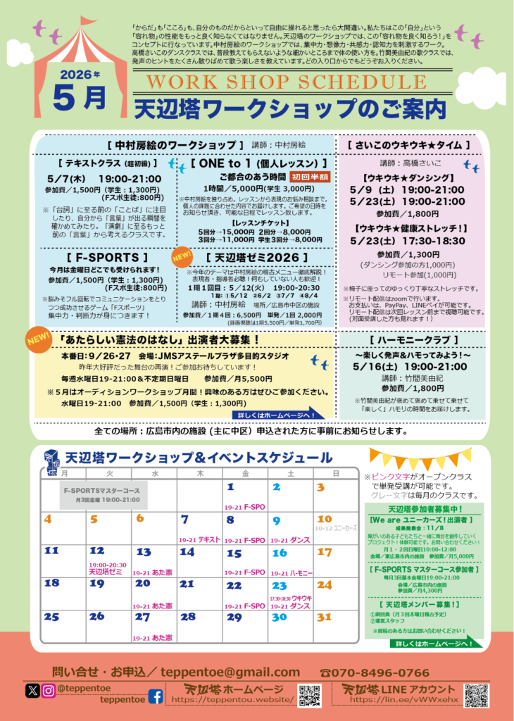 5月のワークショップのお知らせです。ご参加お待ちしてます!